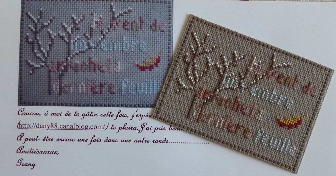 cet échange est organisé par Fred http://mackipik.canalblog.com/, nous devions interprêter le mois à notre idéevoici la jolie ATC que j'ai reçu hier de Granny : " vent de novembre arrache la dernière feuille" !! je peux vous dire que celui qui souffle aujourd'hui risque surtout de faire tomber les arbres !!!