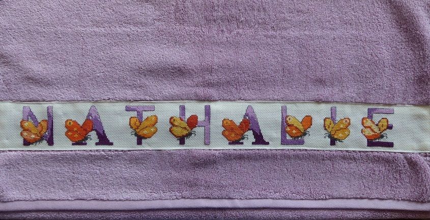 mais voici celui que je lui ai offert, Nath aime le violet et les papillons, un drap de bains sortie de piscine!!!