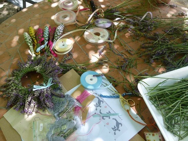 pendant que je préparais le déjeuner les 2 Marie ont taillé un peu de lavande et après le déjeuner nous avons commencé à bricoler, car petite Marie voulait apprendre à faire les fuseaux et les couronnes de lavande, voici notre atelier clandestin sous la tonnelle