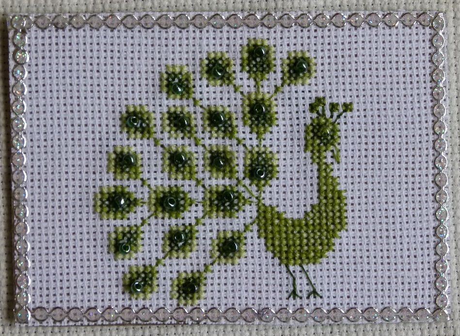 Fred http://mackipik.canalblog.com/ nous a organisé un échange d'ATC sur les couleurs afin d'avoir au final une belle palette de couleursj'ai reçu un superbe paon dans les tons de verts de Patricia avec des perles rocailles, encore un immense merci Patricia et toutes mes amitiés ;